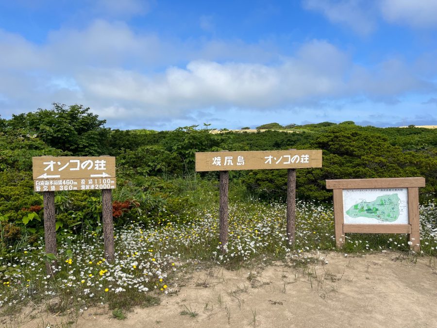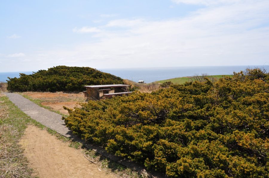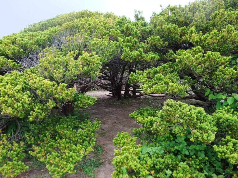 オンコの荘は、焼尻の自然林南部の見晴らしのよい高台に位置し、背の低い独特な樹形のオンコが点々と広がる風景が見られる場所です。オンコの木はイチイとも呼ばれる樹木で、一般には高さ15~20メートルほどに成長します。