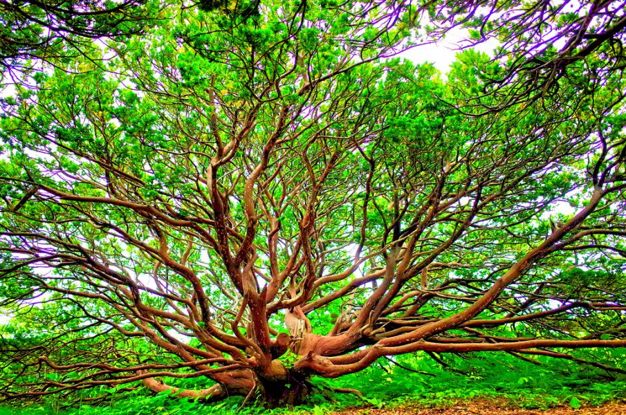 低く広がる独特な樹形のオンコは、日本海から吹き付ける強い風と、冬に積もる雪の重みの影響によるものといわれています。上へ伸びることができず、枝を横に広げながら地を這うように生育し、直径が10メートルを超えるものもある特徴的な姿となりました。