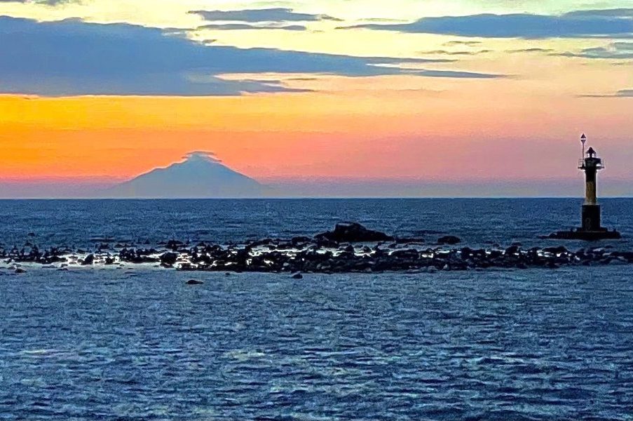 岬からは日本海の広がりを望むことができ、天気の良い日には海の向こうに利尻富士の姿を見ることができます。夕方には灯台と海の風景が重なり、静かな港の景観を楽しめます。